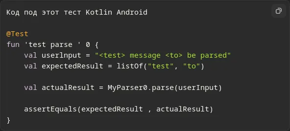 Для создания теста в Kotlin для Android, который проверяет парсинг строки с помощью вашего класса MyParser, вам необходимо написать класс парсера и реализовать тест. Ниже приведен пример реализации парсера и теста для него.