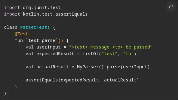 Здесь в тесте создается экземпляр MyParser, передается в него строка userInput, и затем сравнивается результат работы метода parse с ожидаемым результатом expectedResult с использованием функции assertEquals.