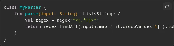 В этом классе используется регулярное выражение <(.*)> для поиска текста внутри угловых скобок. Метод findAll возвращает все совпадения, которые преобразуются в список с помощью map и toList.